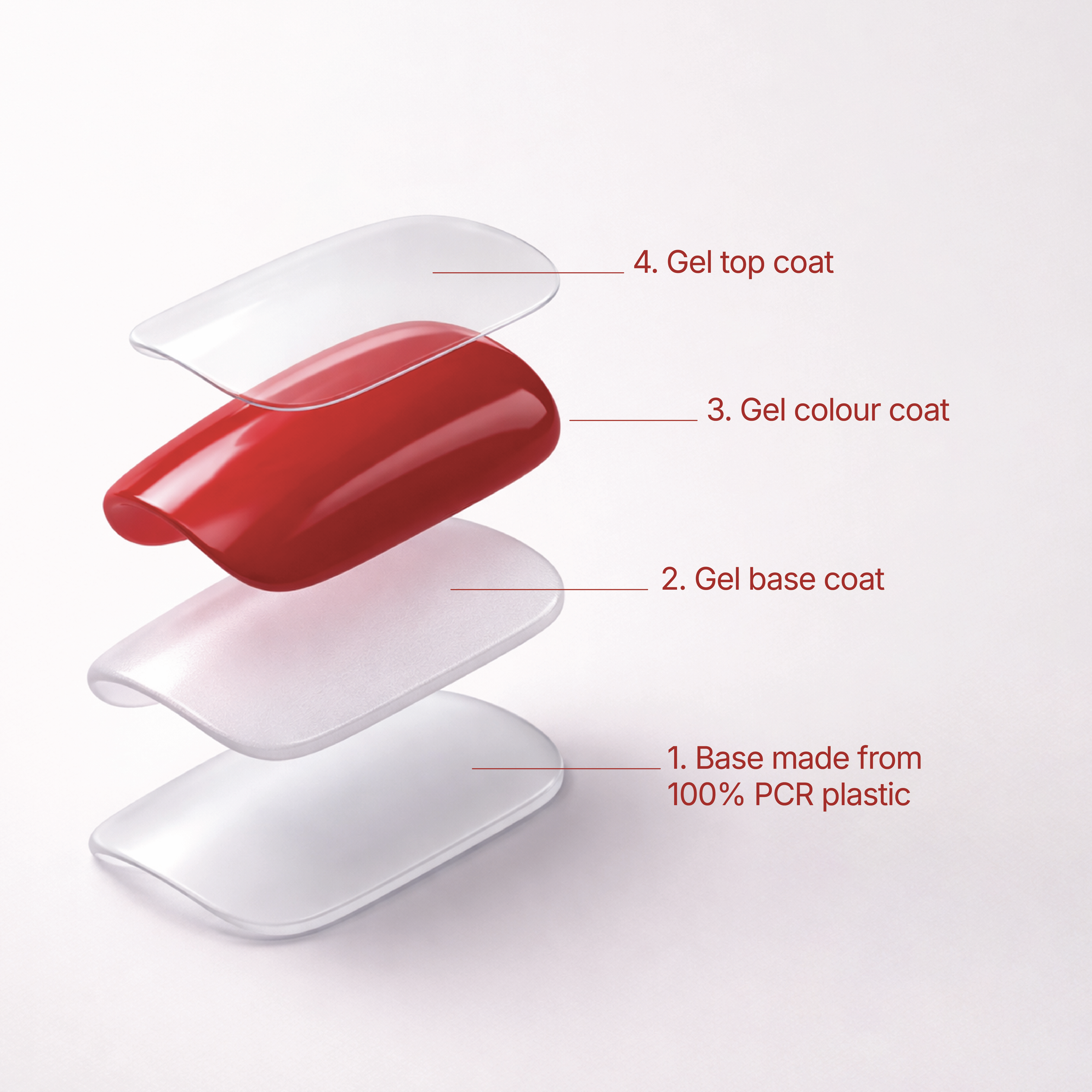 The base of our press-on nails consist of 100% post-consumer recycled (PCR) plastic. This is followed by a layer of gel base coat, a layer of gel colour coat and a final layer of gel top coat. They are free from TPO & HEMA.